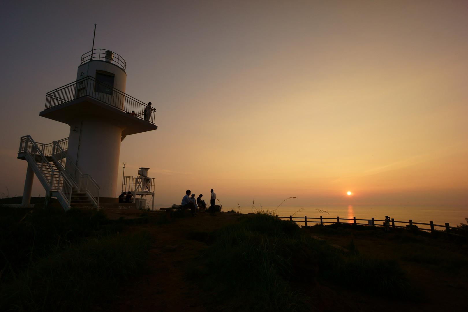 生月町の大バエ灯台です。 前回は昼間に行ったのですが、どうしても夕焼けを見たくて出かけてきました。 柵の下は100m程の断崖絶壁です。ぎりぎりまで行くと視界全てが海を望むことができます。