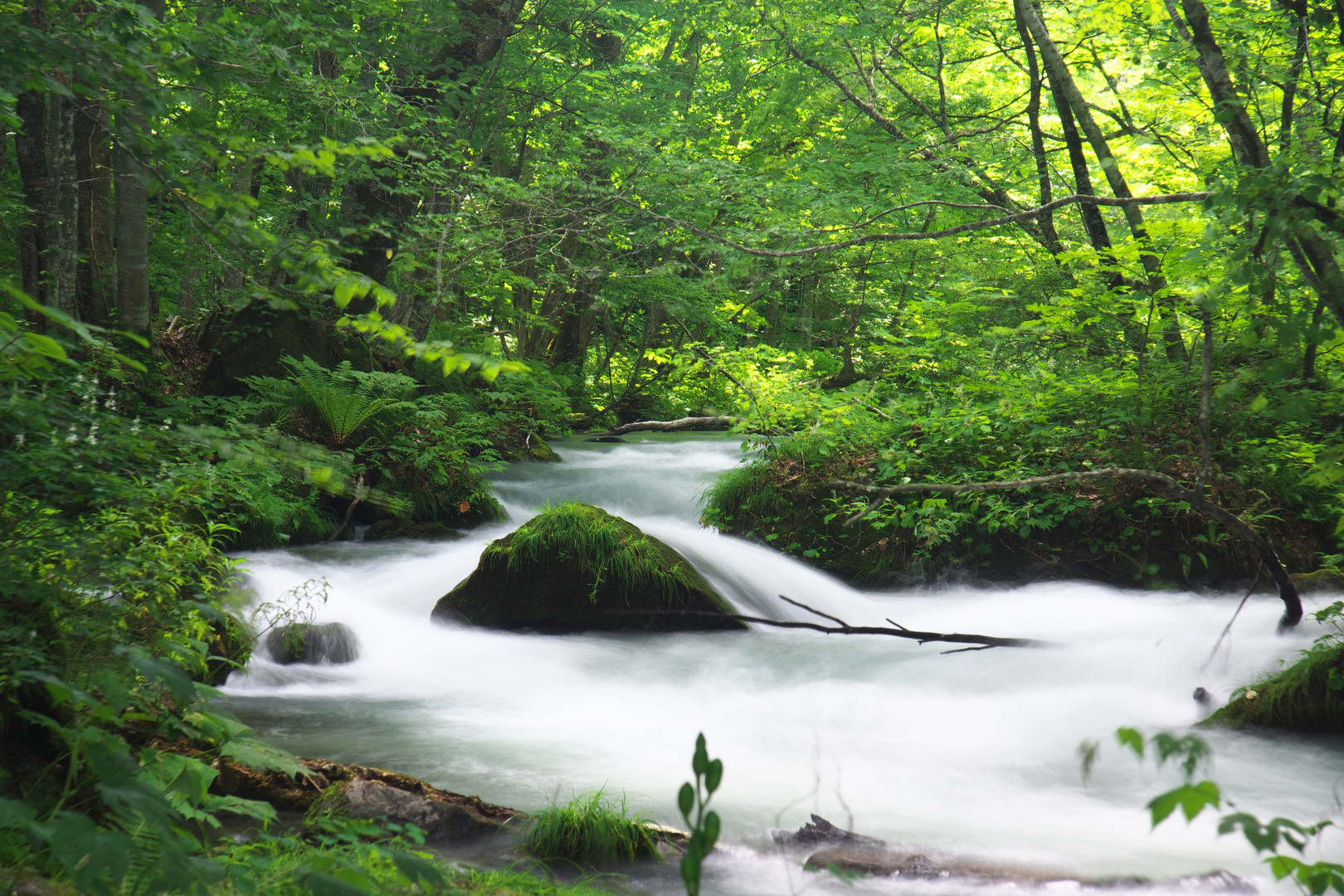 8月の奥入瀬渓流の石ヶ戸の瀬、たおやかな流れが見るもにひと時の涼を、そんな光景。