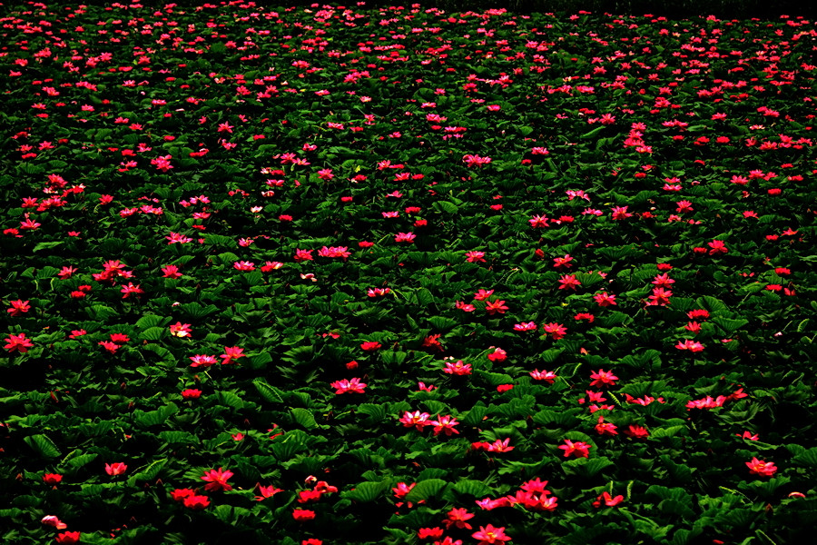 琵琶湖のハスの華が満開の群落。普通に写せばただの群落。すごいなあって感じはこんな感じかな? 絞りすぎかな?