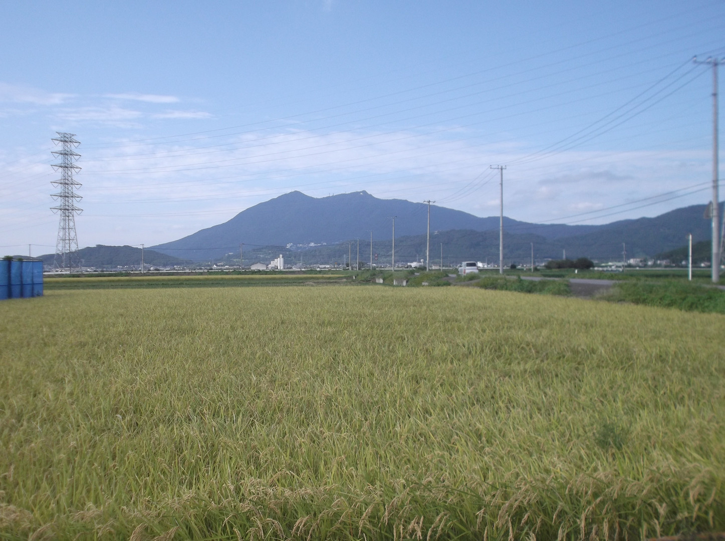 黄金色の稲穂に実った田んぼ。。。。。。 田園地帯の遠くに見える筑波山