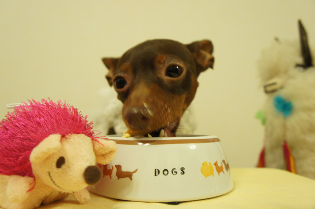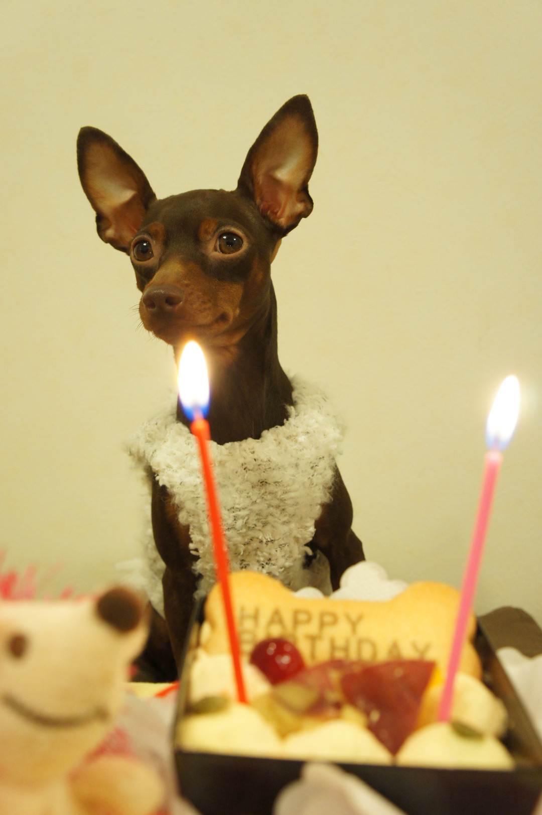 愛犬ドルチェ(ミニチュアピンシャー)の2歳の誕生日 我慢して我慢してパチリ♪ ご褒美のケーキを美味しそうに食べてました。