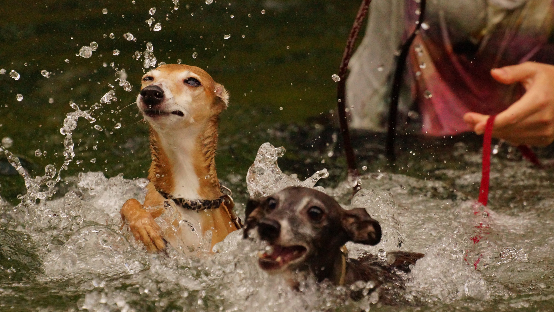 知り合いのワンちゃん達と川に遊びに行った時の一枚なんですが… 一匹は泳げるみたいなんですが、もう一匹は…ちょっと苦手みたい