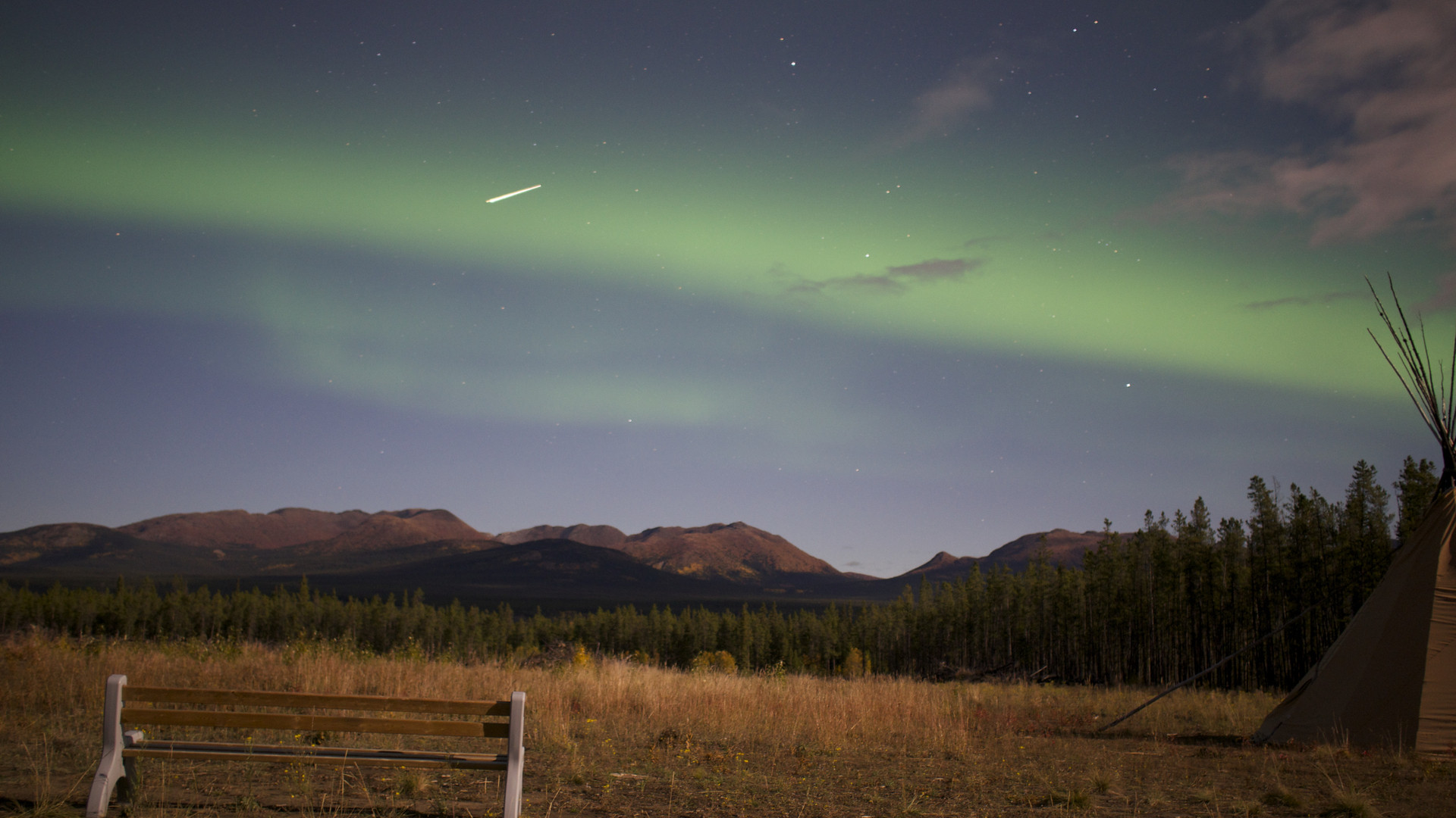 カナダのホワイトホース、北の空に現れたオーロラです。シャッターを開いている間に流れ星が見られました。