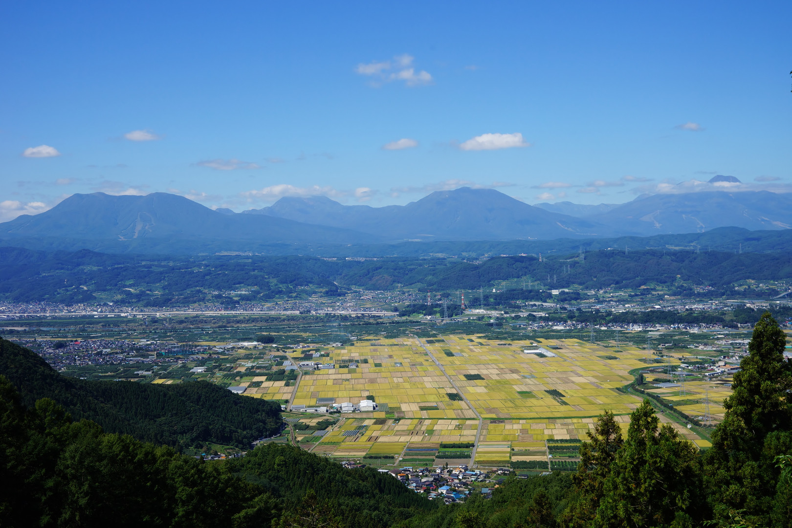 稲刈が進む田んぼ。高台からは、パッチワークみたいで楽しい。 北信5岳も屏風みたいで落ち着く風景。
