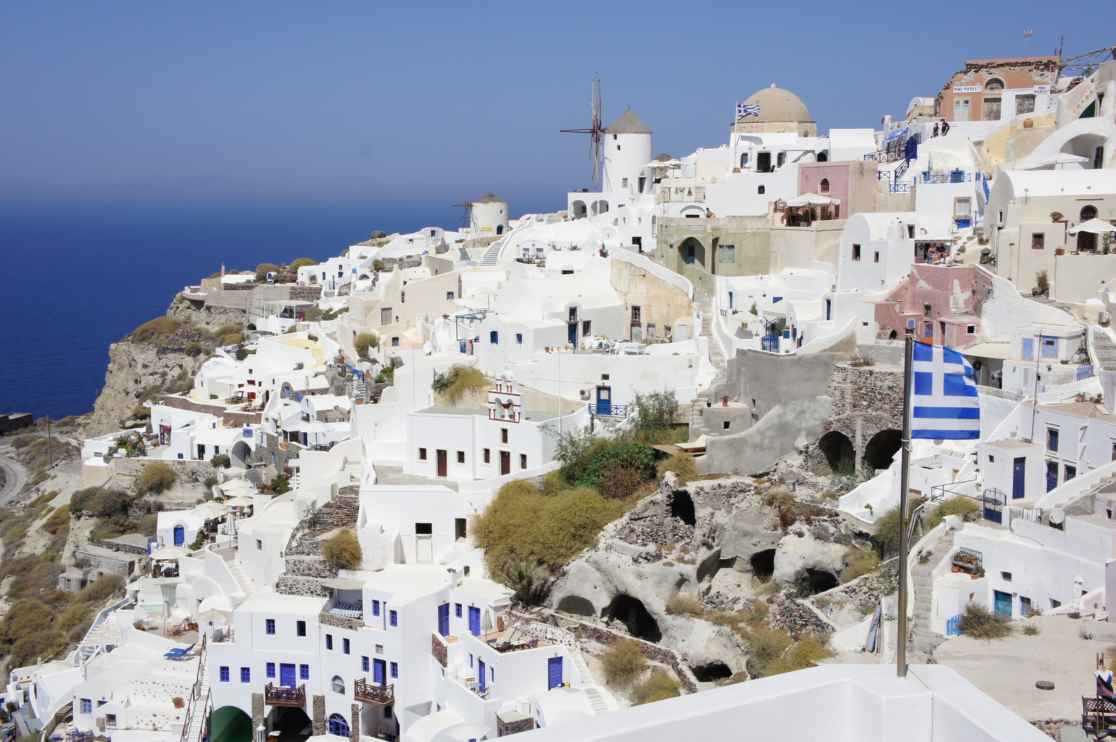 ギリシヤ・イアのエーゲ海と街並み。風車が良いアクセント♪