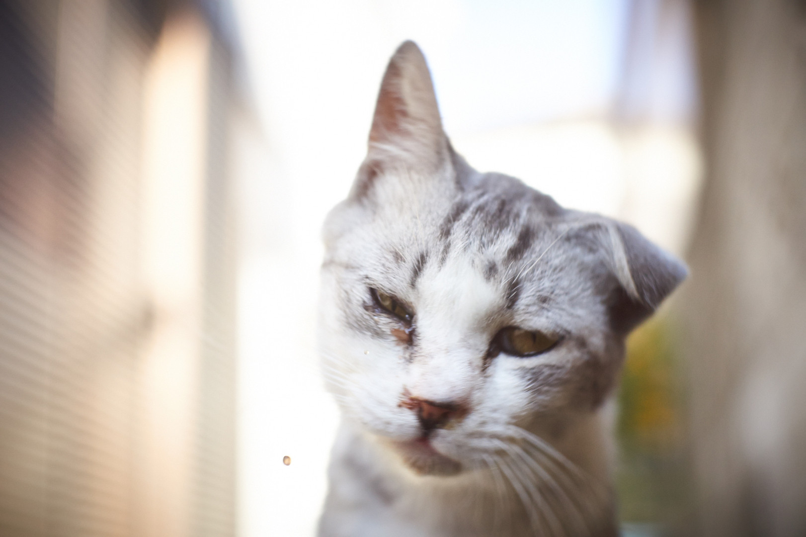 毛づくろいしてるところだったので、涙がとびちっています。 耳も折れて、なんだか面白い。
