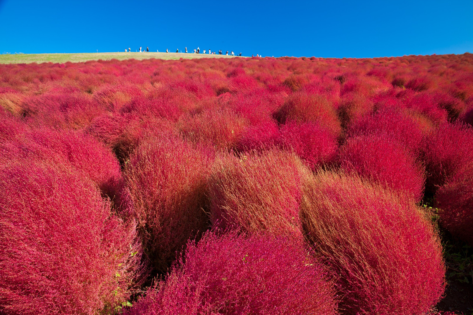 ひたち海浜公園の有名なコキアの紅葉です。 コキアはマゼンダレッドに紅葉するんです! とても神秘的で不思議ですね。