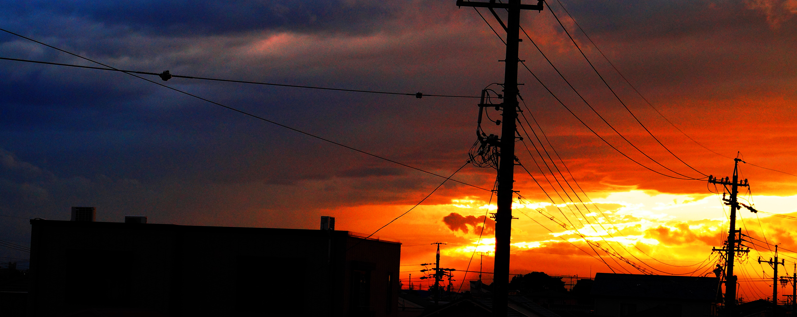台風の影響で、日中は真っ暗だったのですが、 夕方になり太陽が雲の切れ間から出てきたので、 思わずシャッター切りました。 ベランダからの撮影の為、 電柱等、写ってますが…