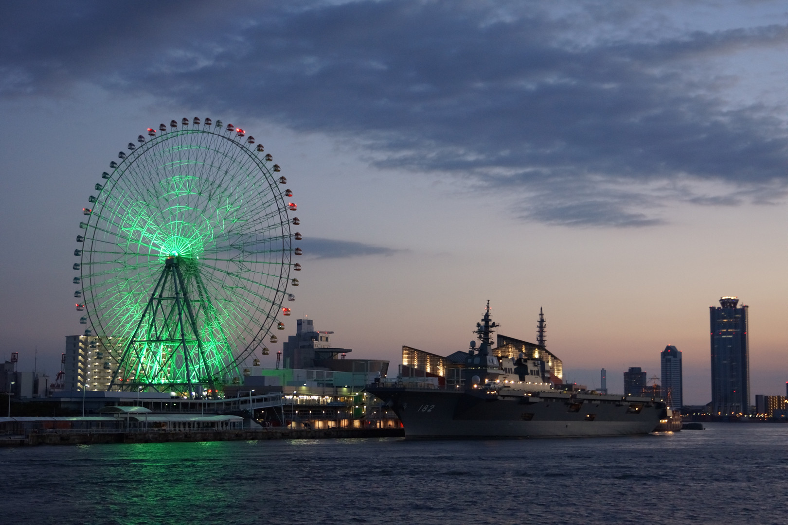 対岸に天保山を臨む地点より、護衛艦いせの夜間点灯直後の様子です。
