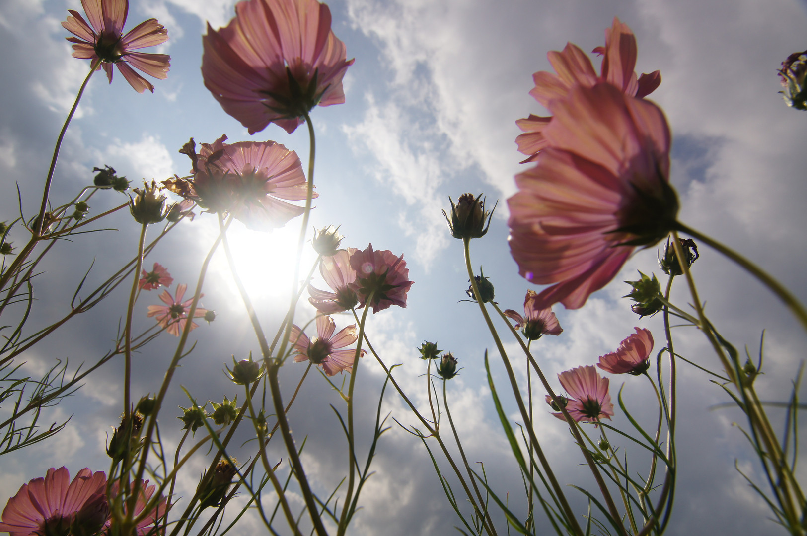 うすいピンク色?のコスモス畑から秋空を見上げました。