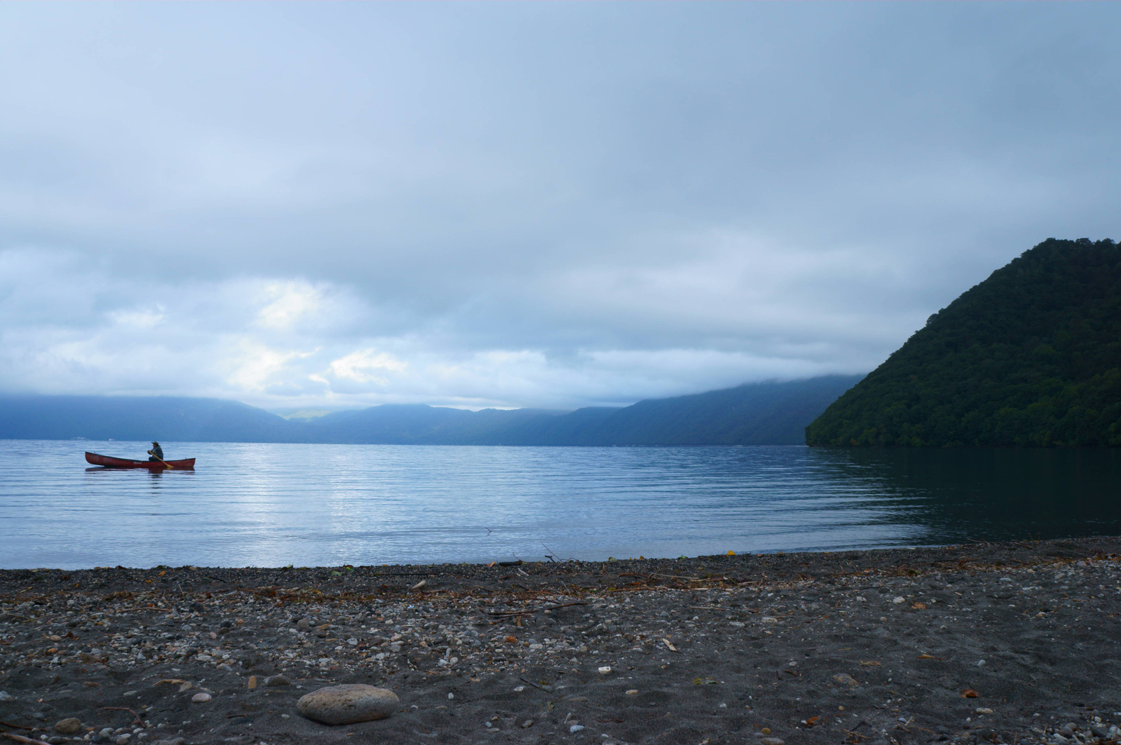 早朝、カヌーが通ってました。 天気は分厚い雲に覆われていたのですが、少しだけ光が見え、カヌーを引き立ててくれた気がしました( *´艸`)
