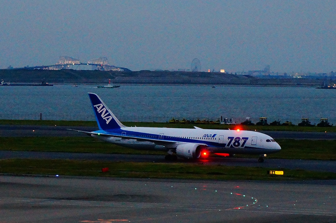 滑走路を移動する787機の赤いランプが印象的でした。 この赤い色は常についているわけではなく、何秒おきかに点滅していたので そのタイミングに合わせて撮影するのがやや大変でした。