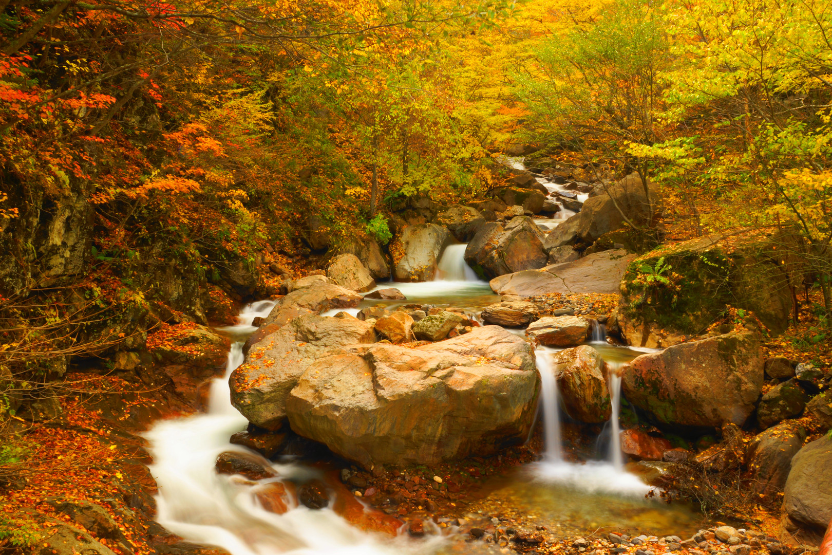 米子大瀑布の下流の渓流です。 木々の葉の色がとても綺麗だったのと画面奥からの流れがすばらしかったので低速で切りました。