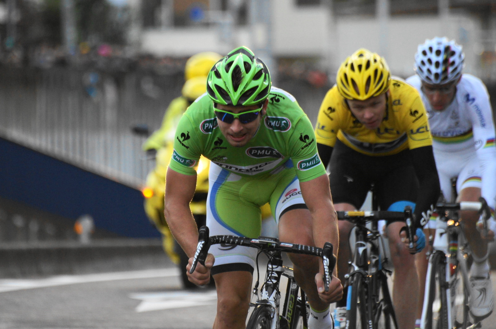 さいたまクリテリウムbyツール・ド・フランスでの最終周でのひとコマ。 マイヨベールのペーター・サガン、マイヨジョーヌのクリス・フルーム、アルカンシェルのルイ・コスタの豪華すぎる3人による優勝争いの様子を撮影しました。