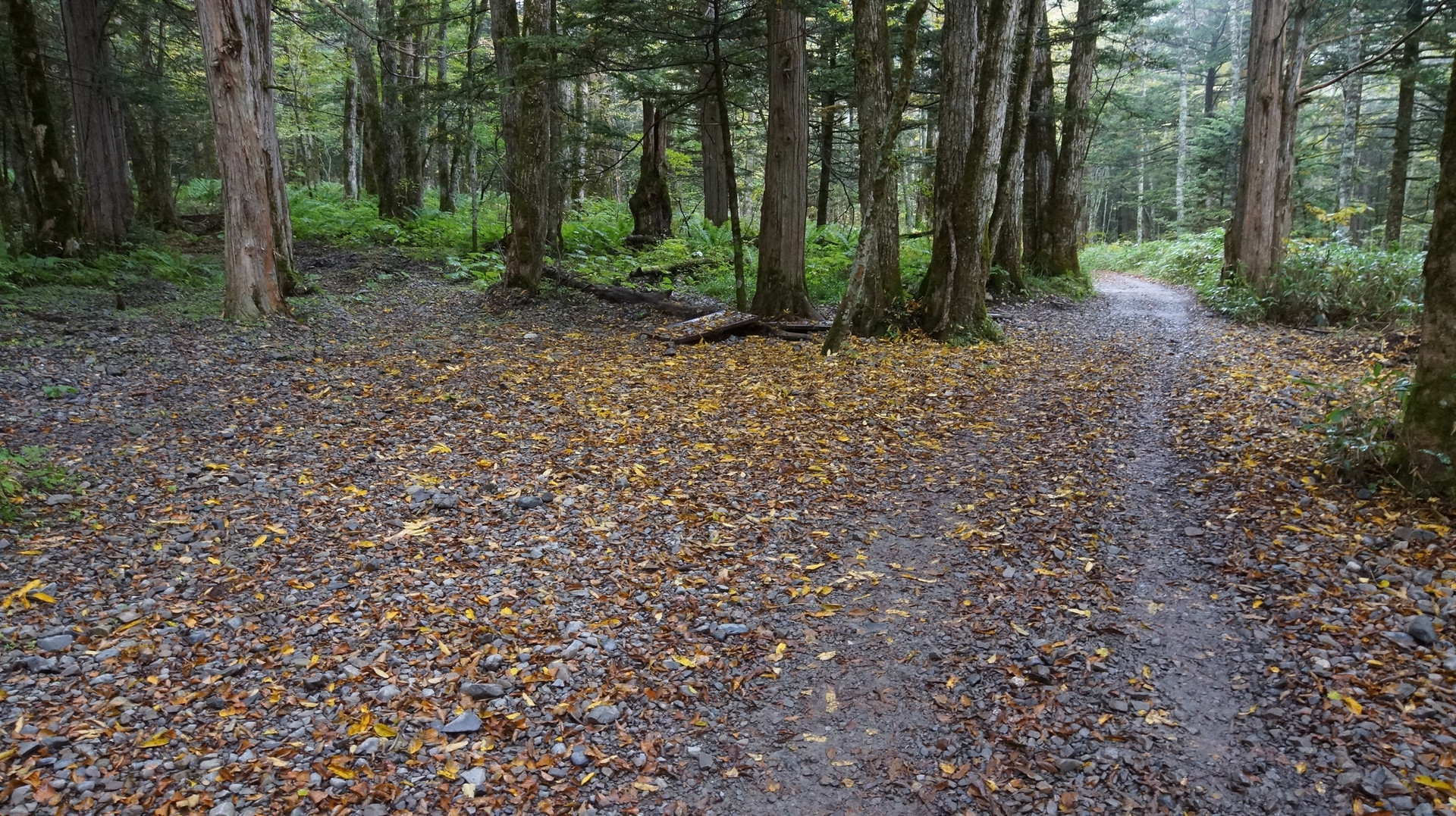 登山後のうんざりするあの上高地の道も、休日でもごくたまに人がいない瞬間がありした。落ち葉とともに。