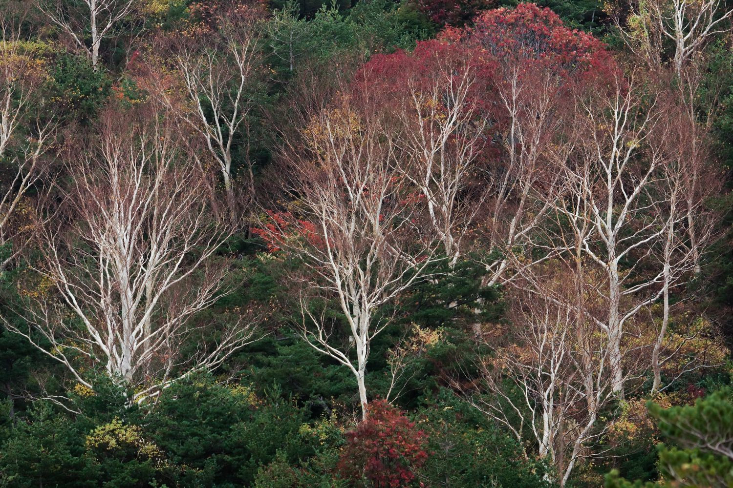 山肌に映える白樺、ダケカンパの白い肌が目を引いていた。 白い肌の美しさに感動した。