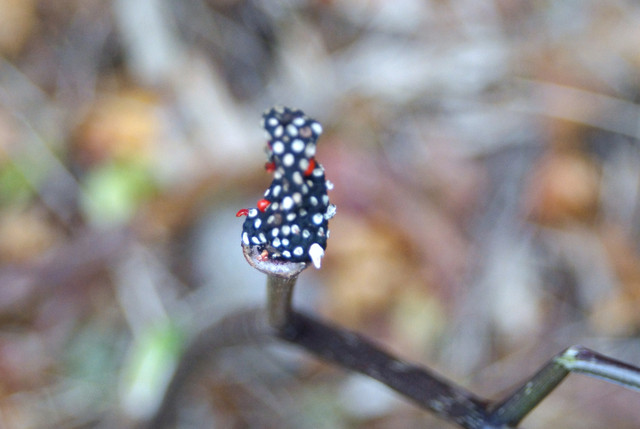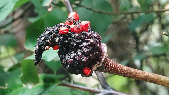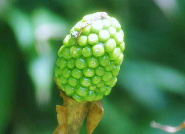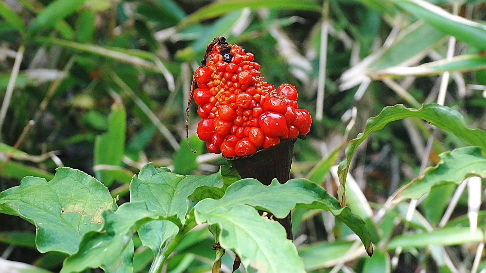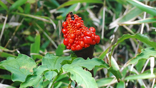 昨年に11月に最後の出来上がり、写真5の’魔女の帽子’を山中で見つけた私はこれが出来るまでの経緯をようやく理解できました。 マムシグサが花を付け(1)、青い実となり(2)、赤く熟し(3)、すこしづつ 鳥についばまれ(4)、最後に魔女の帽子(5)となるのです。 この経緯を解明するため(ほかの動機もありましたが)4回、雲仙に通いました。