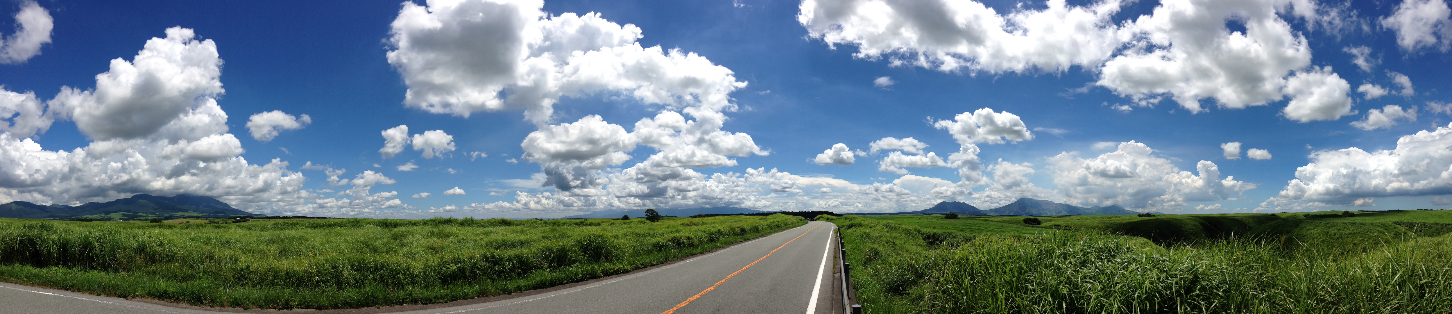 やまなみハイウェイです。向こうに見えるのは阿蘇山、くじゅう連山
