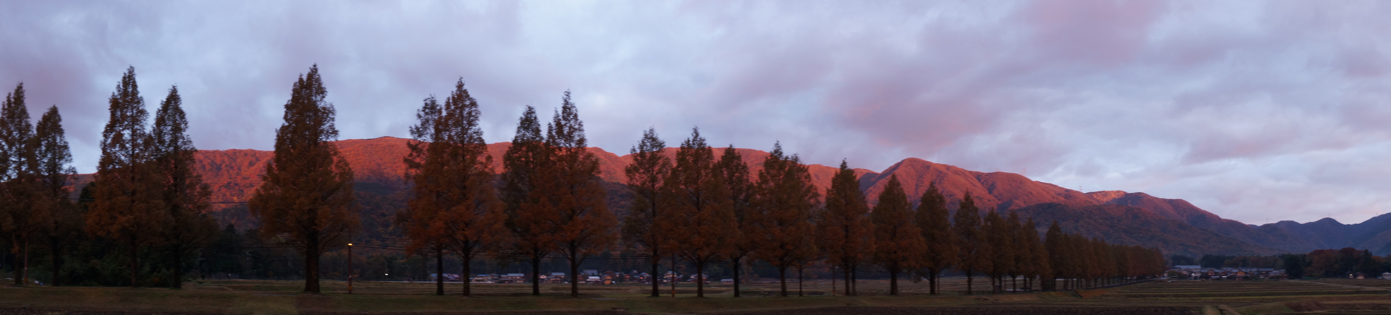 朝日に照らされた山が真っ赤