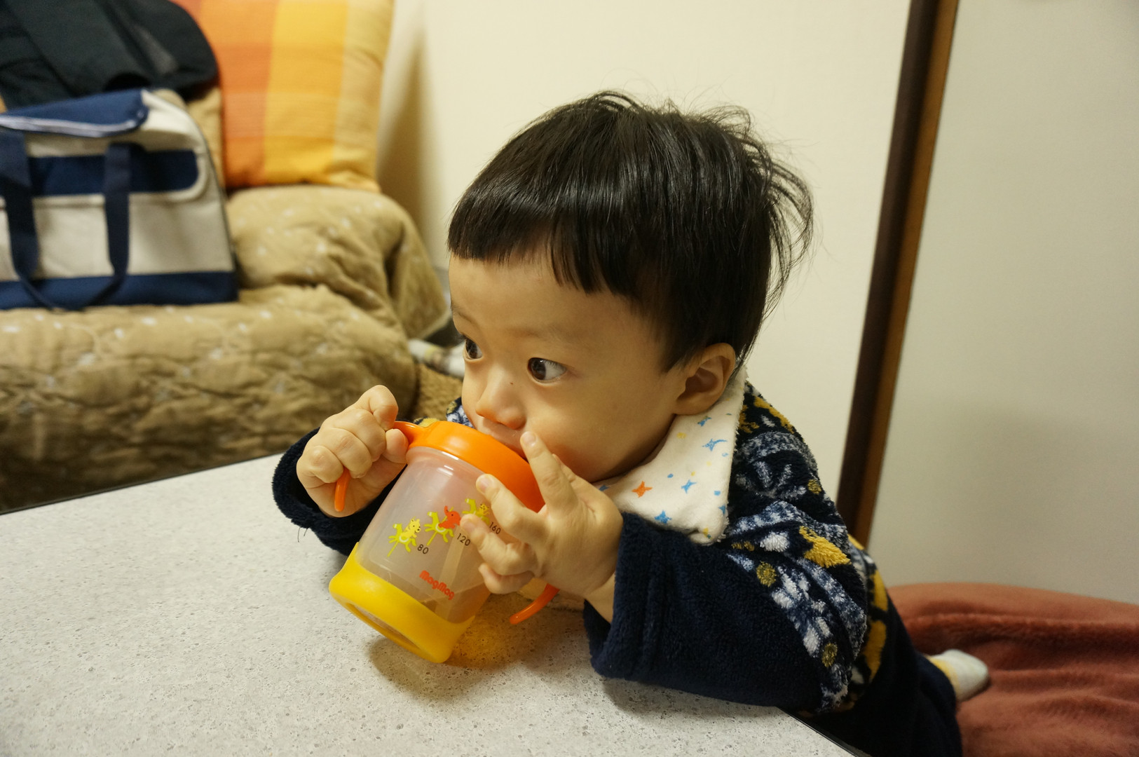 いつの間にかストローを使って飲むようになりました。 今では自分で持ってゴクゴクいってます。 時々ムセてますが(笑) 子供の成長って早いですね・・・