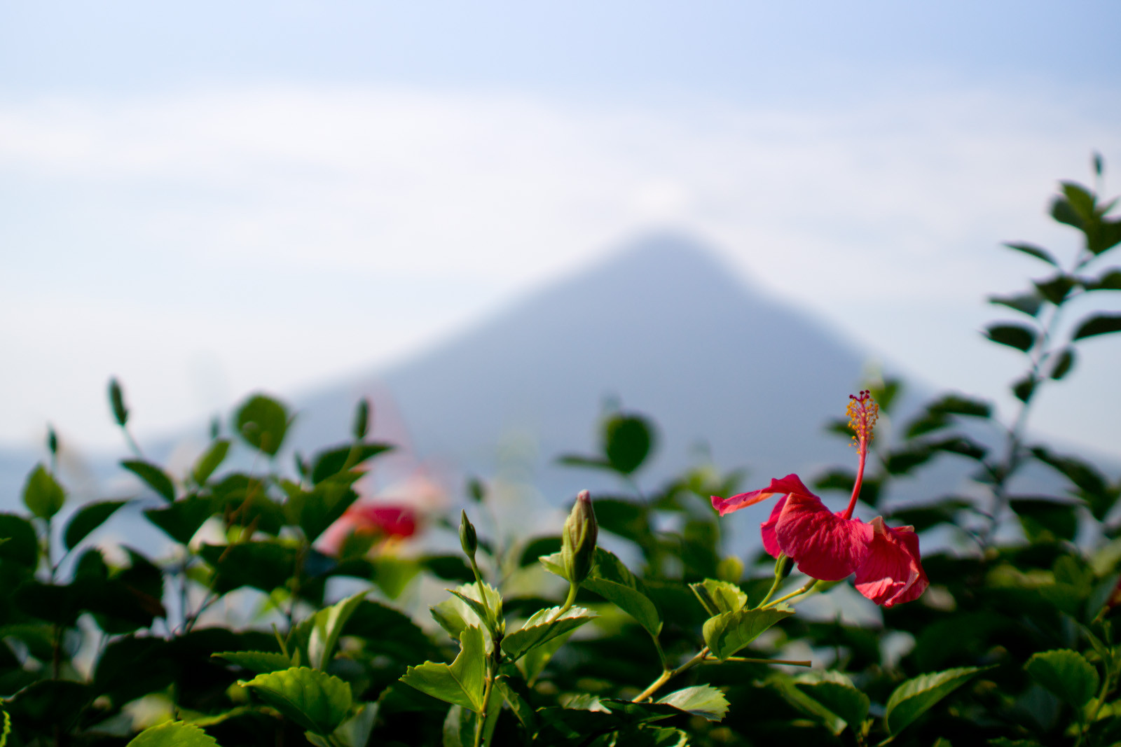 開聞岳の見えるところでいいトコないかな〜とクルマで回ってた時に、なんだか変わったところがあったので入りました。そこから見た開聞岳はいい感じだったんですが、海上に重機がいたので、手前のハイビスカスにピントを合わせまときました。