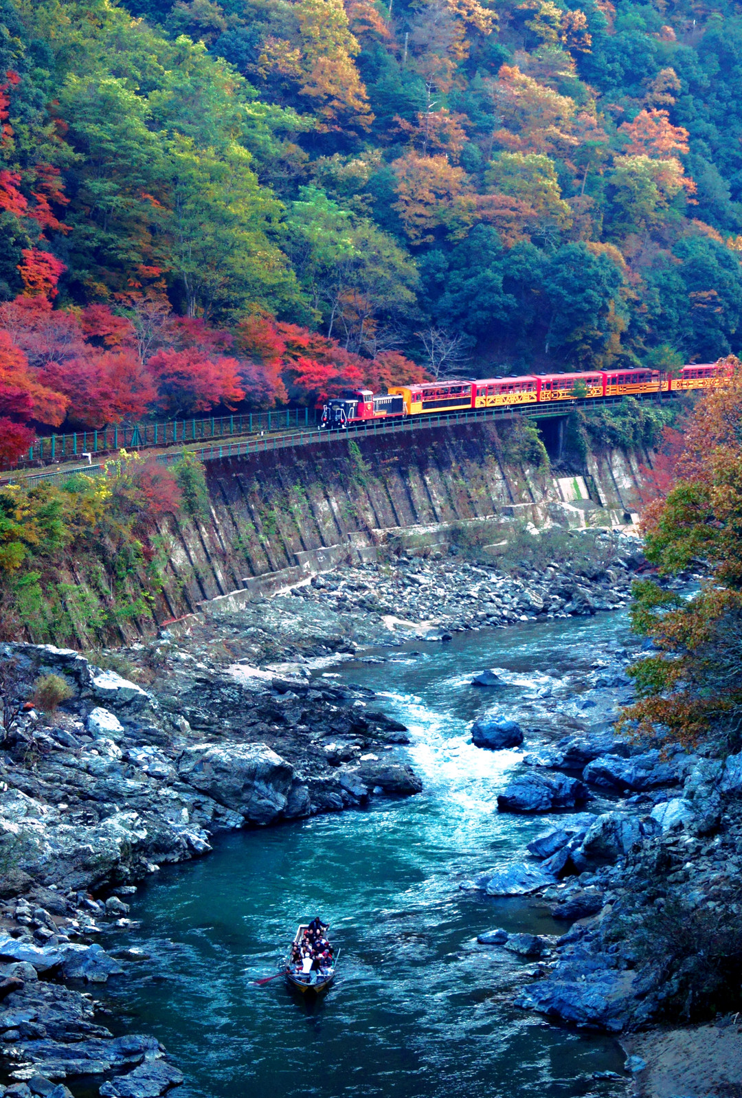京都 保津峡の紅葉とトロッコ電車と川下りの船の3点セットです。グッドタイミングでした。結構何時間も粘ったので体が芯から冷えて寒かったですが・・・・ もう少し天気が良ければ良かったけど・・・