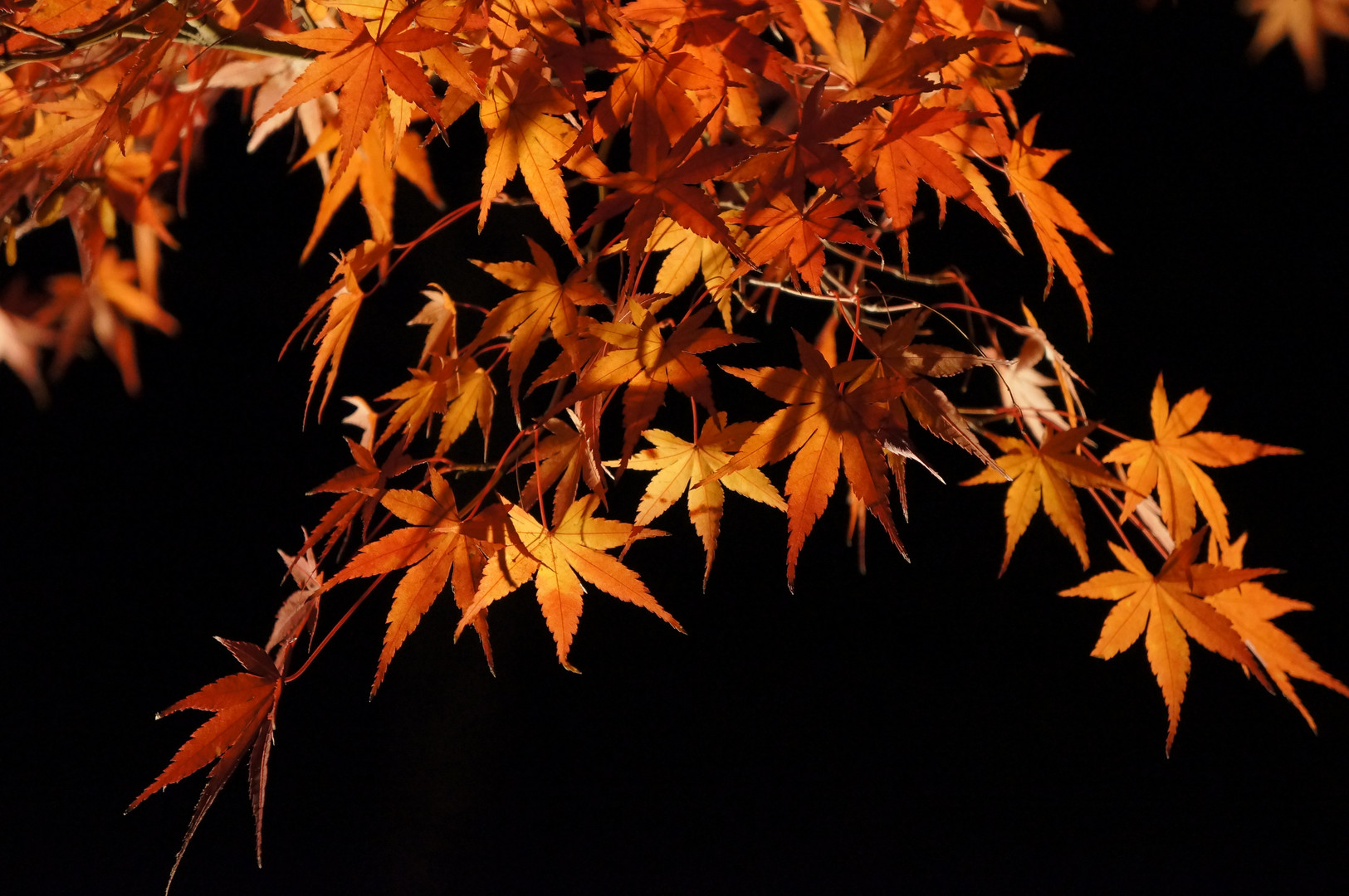 ライトアップされた紅葉。 夜の闇に、その朱色が美しく浮かび上がっていました。