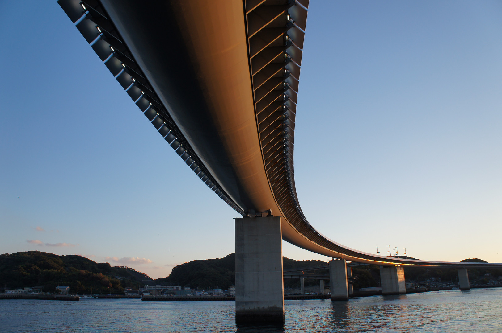 天草市牛深のハイヤ大橋に夕日が当たってほんのり赤くなっているところを撮影しました。