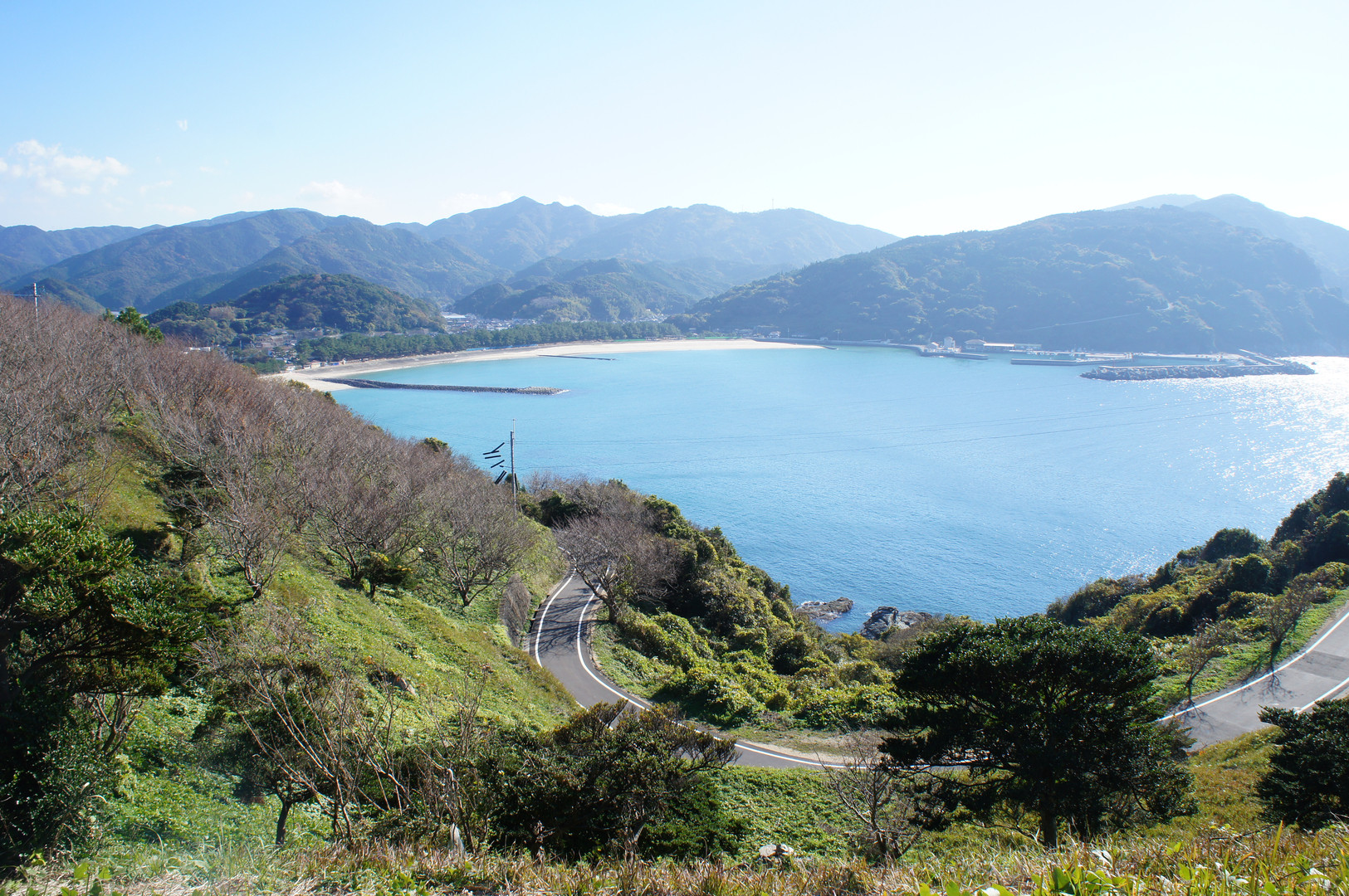 海・白浜・山の美しい色のコントラストを撮影しました。