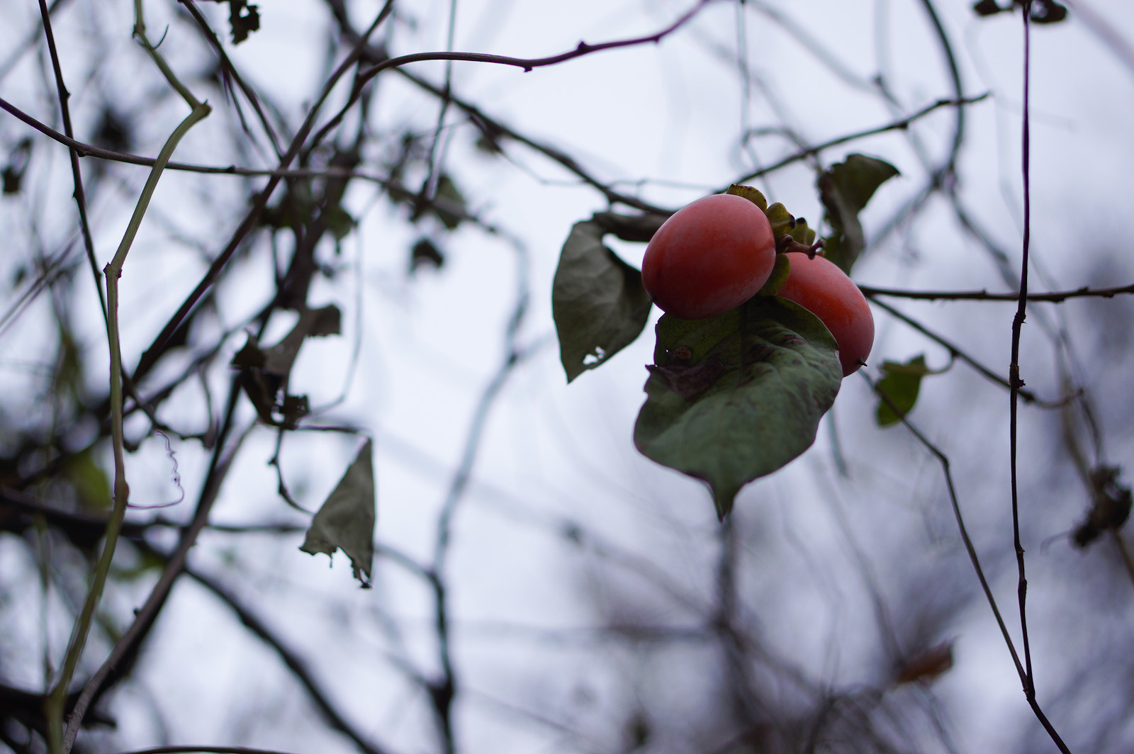 秋終了と言いたくなるような寒空と、葉の落ちてしまった枝と残り少なくなった柿。 気がつけばすっかり冬ですね。