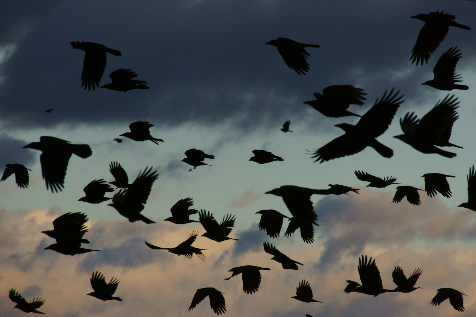 夕方になると何処からともなくカラスの大群がやってきて、東の方へと帰っていきます。
