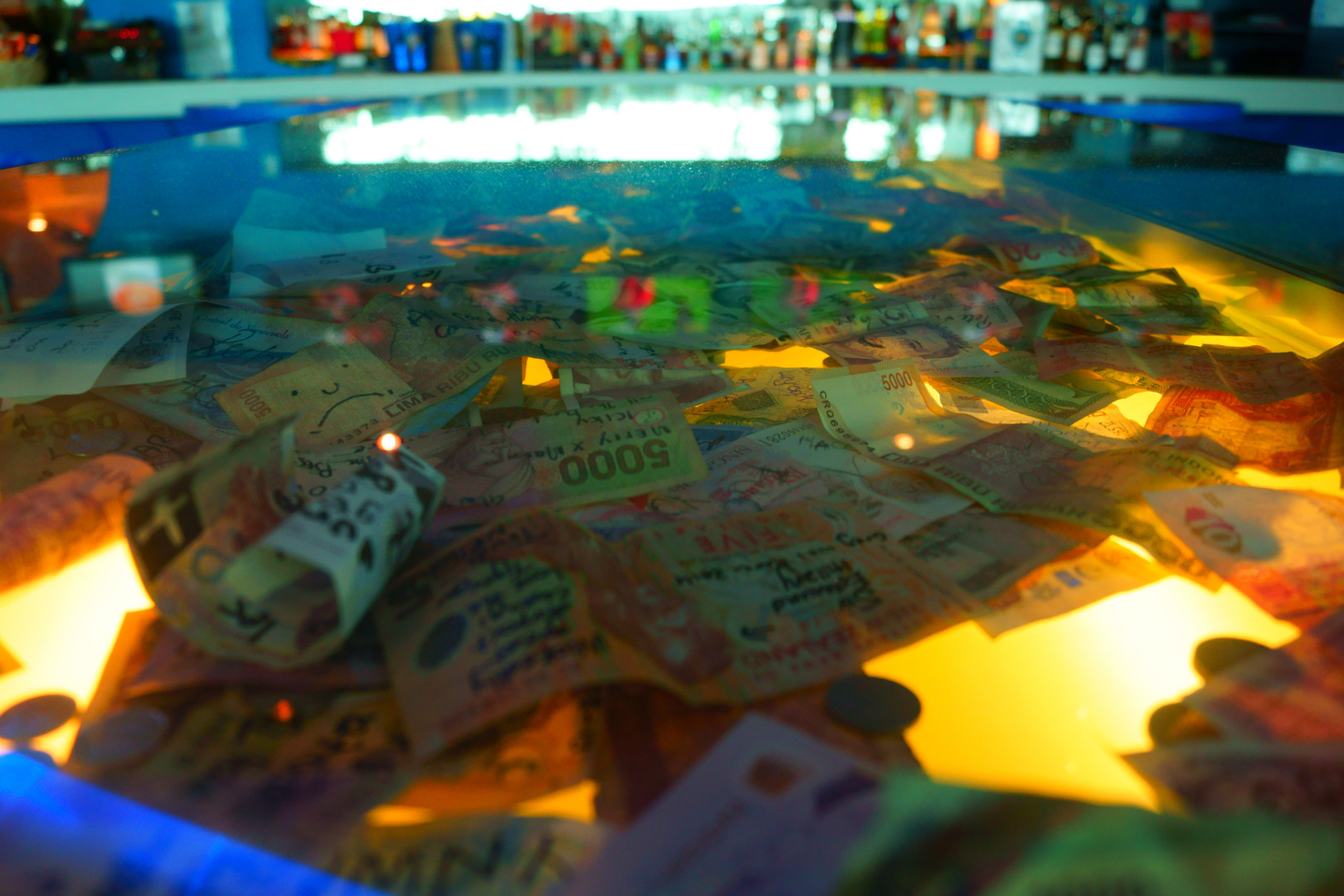 シンガポールのチャンギ空港にあるカフェで目にした紙幣達です。 旅の中継地らしく使い古しの紙幣達が照らされていました。