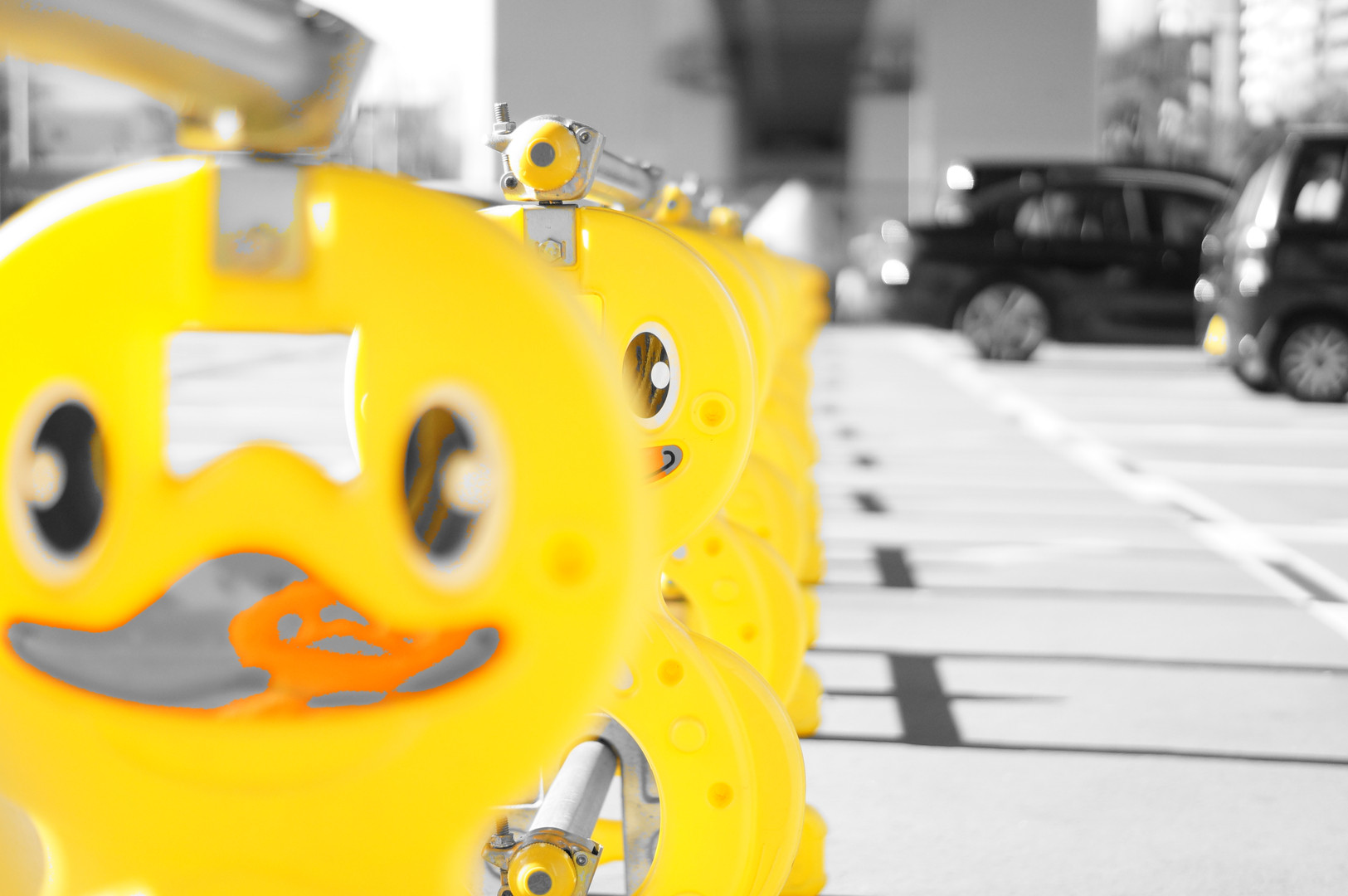 グアッ! グアッ! グアッ! 名古屋高架橋したにあった駐車場の仕切りです。 可愛いのに 集団で整列してあるため どこか怖いです
