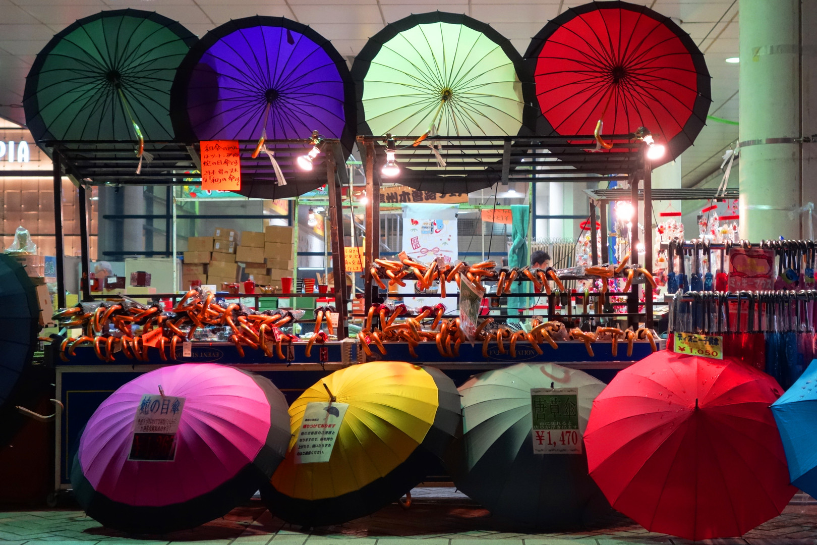 お腹がすいていたせいか、遠くから見るとお肉売り場かと思いました 正体は傘の柄でした 傘思いっきりひらいてますし・・ 和傘ってなんとも趣があります