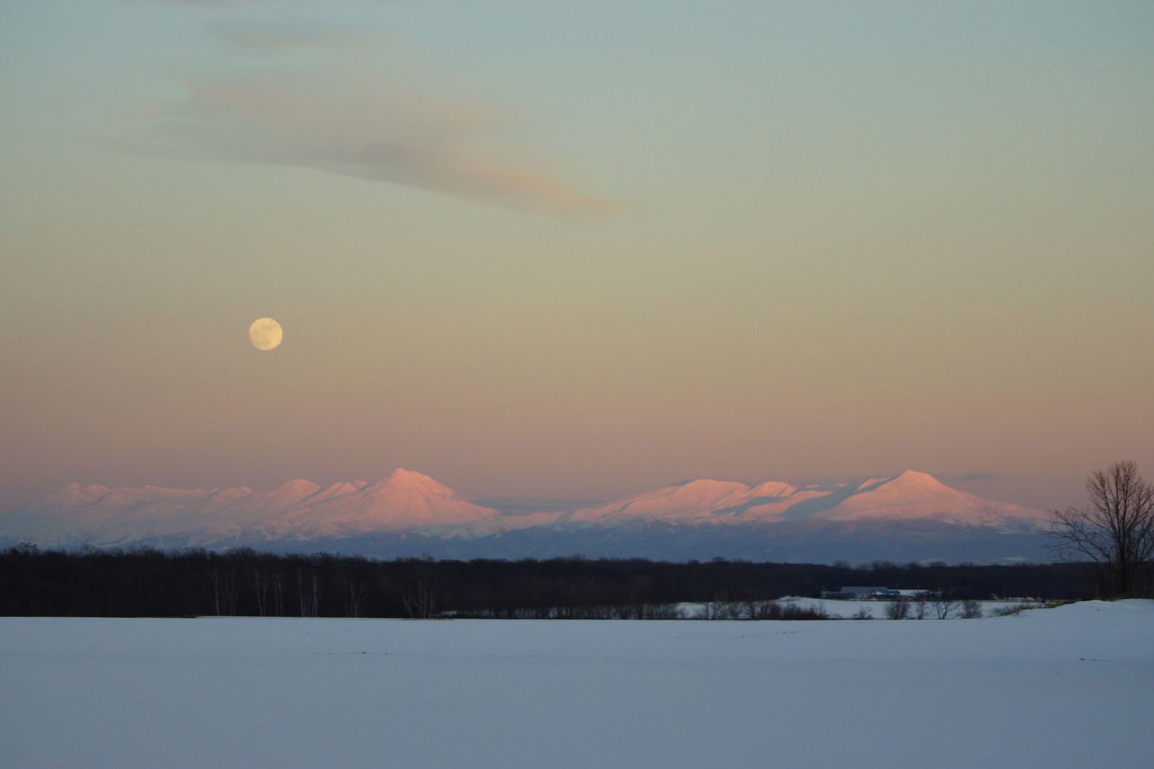 お月さんを真上に、日が傾く中で、 夕日に染まった知床連山。 行くたび雲に隠れていたり、全体見渡せ ない日が多い中今日は、素晴らしい知床 連山に会うことができました。
