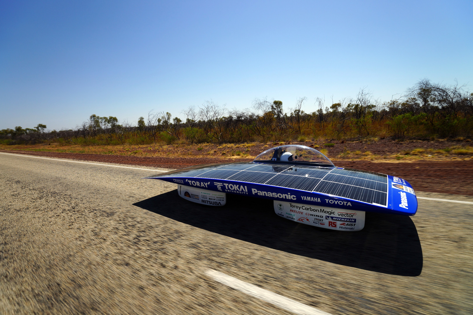 2013年にオーストラリアで開催された World Solar Challenge 大会2日目、スチュアートハイウェイを走行する東海大のソーラーカーです。
