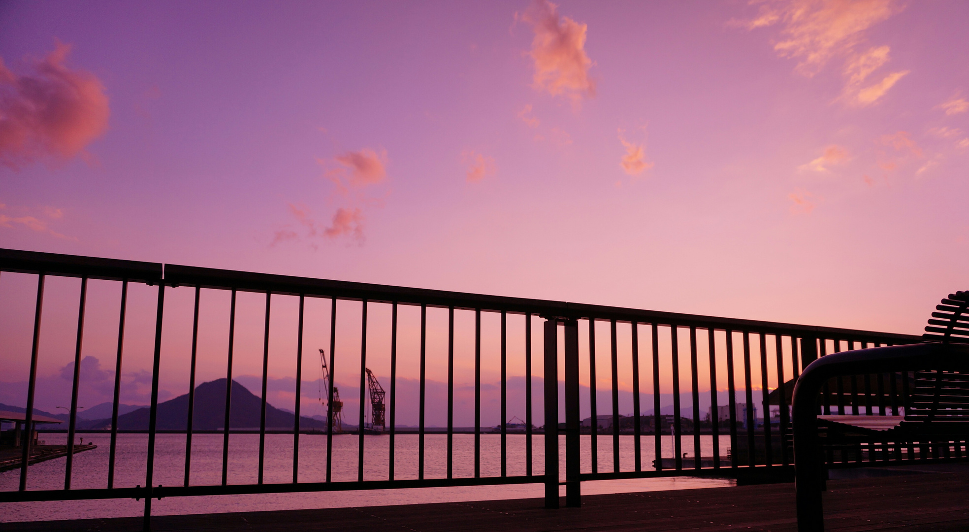 日没時@広島 宇品港。呉経由松山行き高速艇の待ち合い時間に綺麗な夕陽と遭遇。ホワイトバランスを調整しフィルター替わりとする多分初歩的なテクニックを使ってドラマチックさを演出。