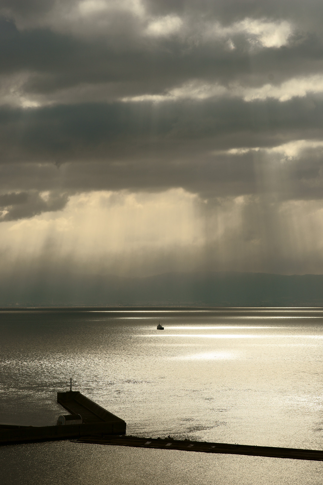 須磨の沖合の光芒です。 モノクロのように見えますがカラーの設定のまま撮り、コントラストを強調しました。