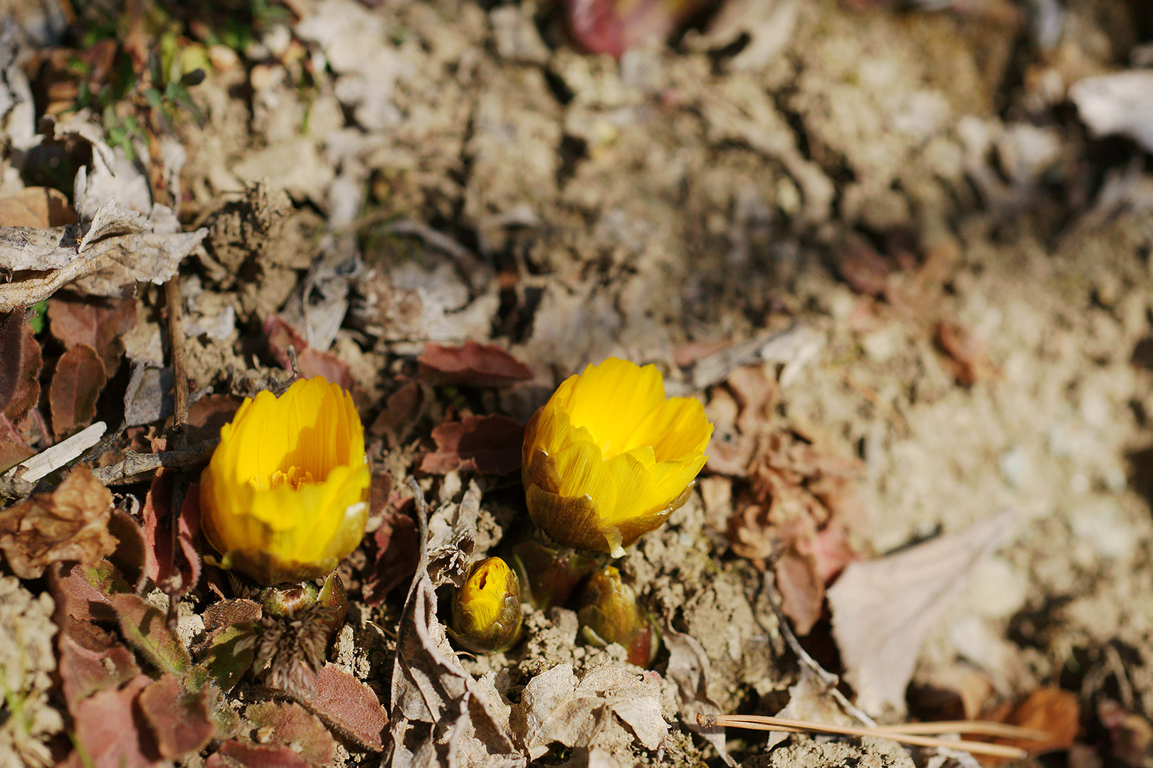 福寿草が土から顔を出し始めました。 福寿草は葉が出てきてボリュームのある花をみるのもいいけど、やっぱりこうやって土から顔を出してきたところが一番かわいくて好きですね~