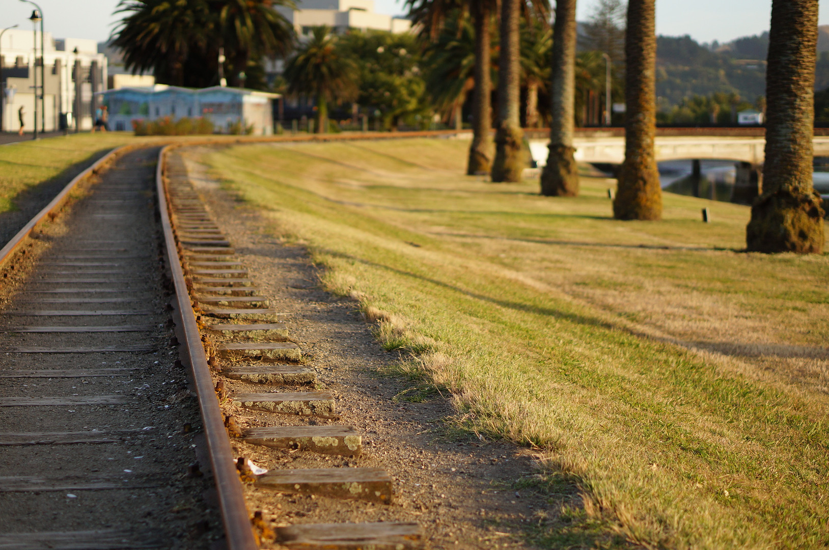 廃線になった線路。 朝陽を受けて芝生に落ちたフェニックスの影。 ここは、キャプテン・クックがニュージーランドで初めて上陸した町です。 今はもう誰も走らない線路は、いつかの夢の跡でしょうか。