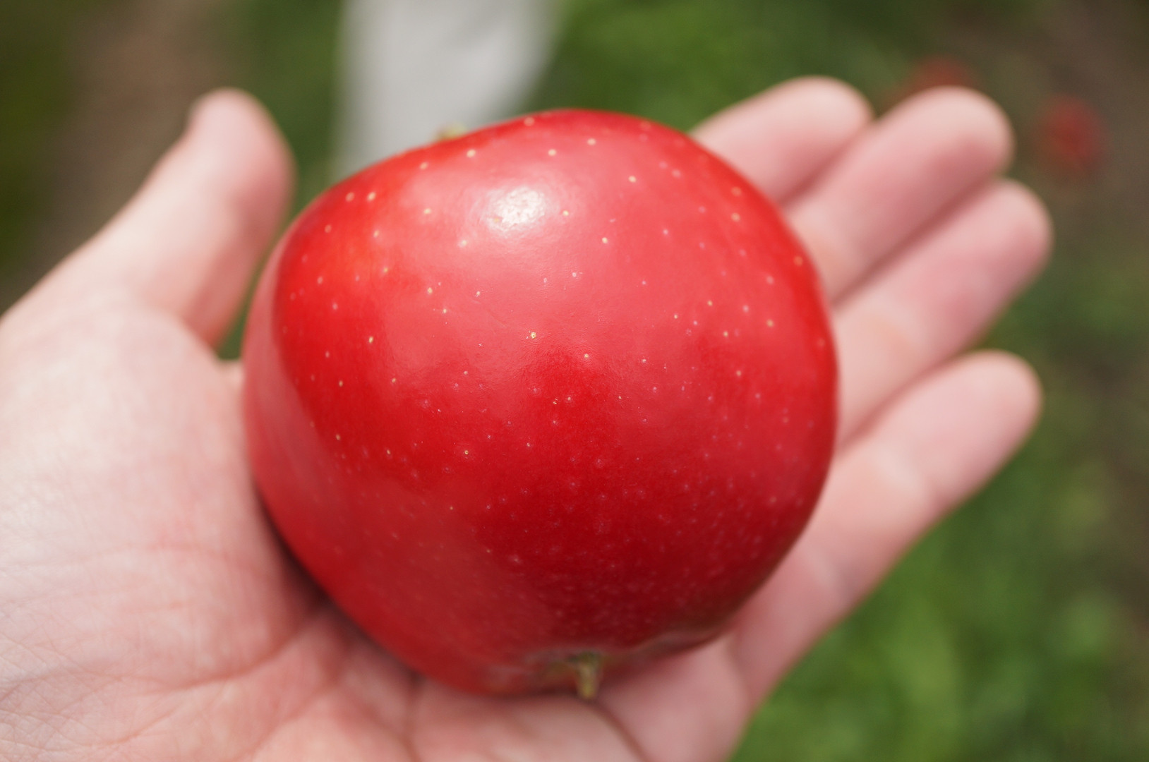 南国の太陽に照らされて真っ赤に色付いたりんご。 ここにしかない「Breeze」という品種です。 空一面どんより薄曇りでしたが、手のひらの上はとても明るく鮮やかでした。