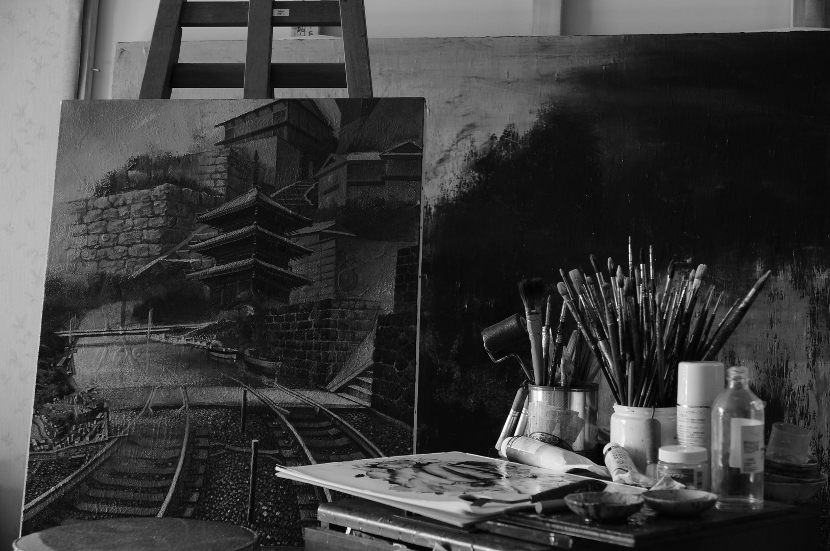制作中の作品とともに。背後にあるのは100号2枚。これから制作が始まる。