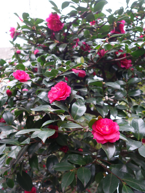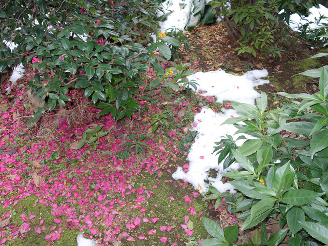 山茶花が咲き始めました 冬の庭に彩を添えてくれます でも すぐにすずめやヒヨドリが見つけて 花びらが無残に散らされてしまいます そのうえ今年は雪 雪 雪・・・