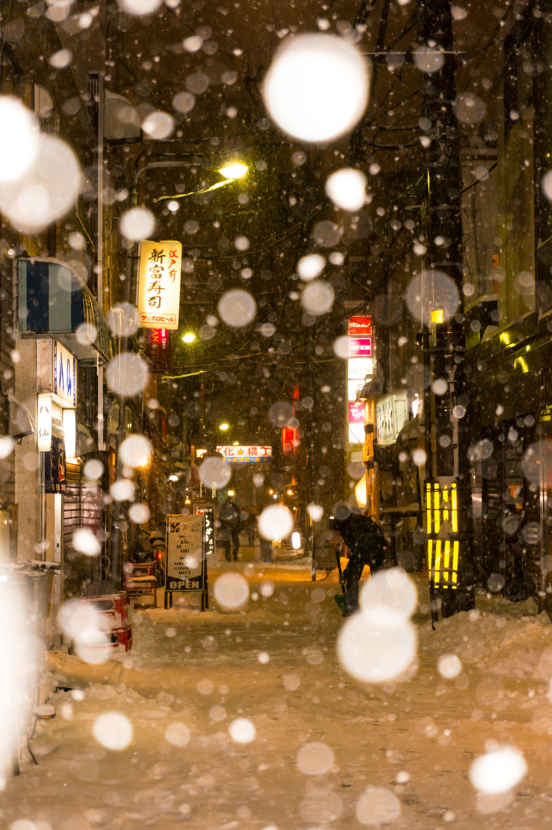 2/8、大雪の夜の文化横丁です。 雪の降る中、せっせと店先の雪かきをしていました。 まさか翌朝、あんなに積もっているとは・・・