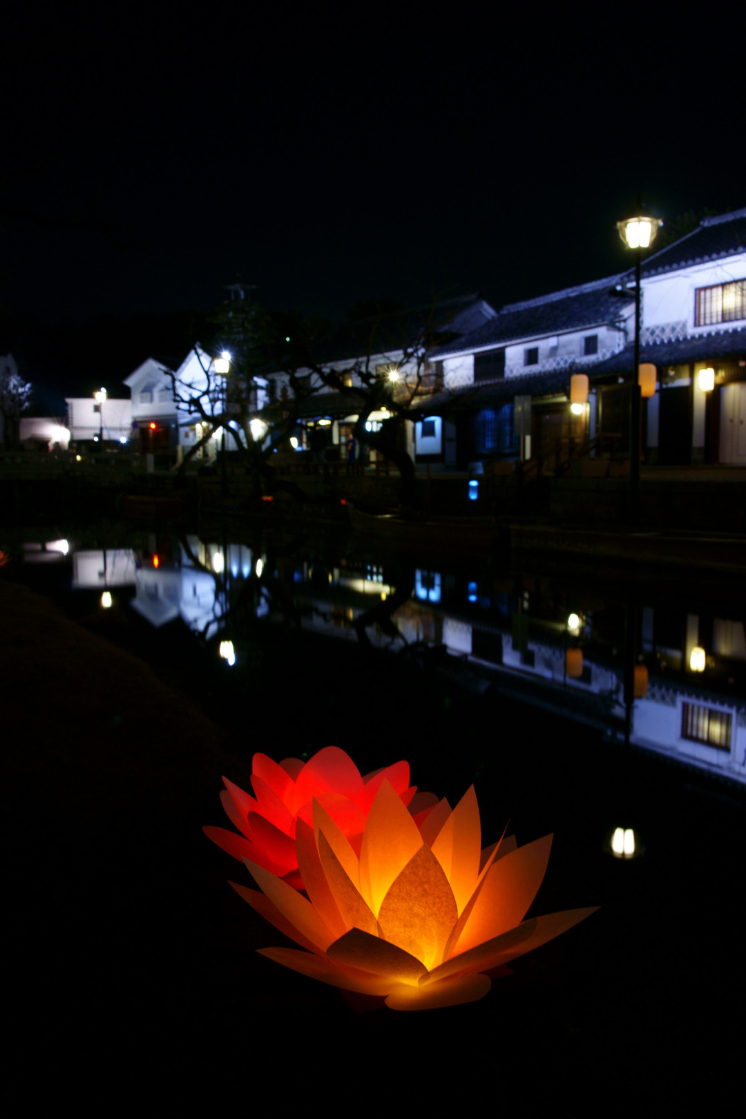 倉敷美観地区での「倉敷宵あかり」です。蓮の花をモチーフにした灯りが倉敷川畔に置かれていました。