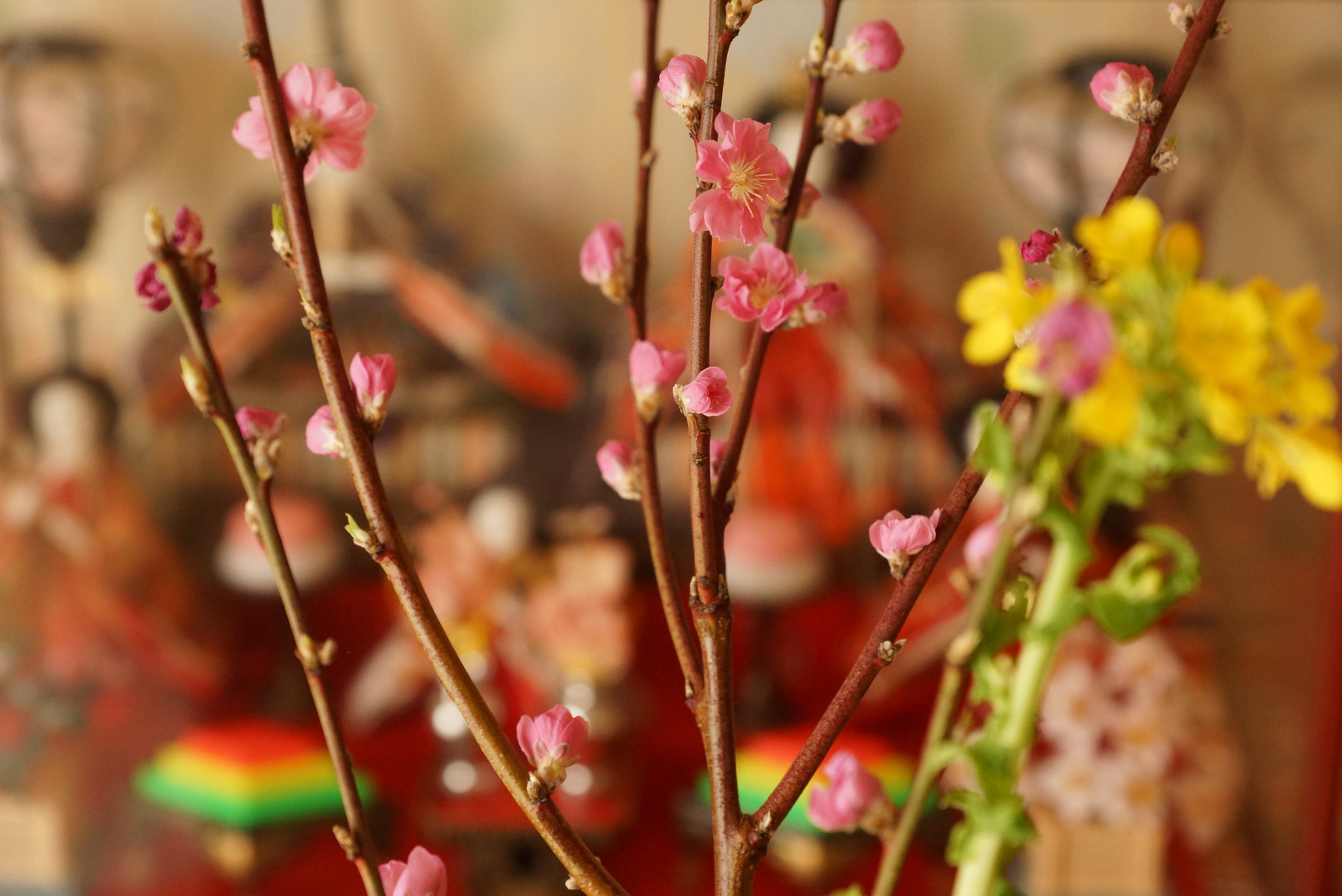 雛祭りですね。 娘が活けた桃と菜の花を撮ってみました。
