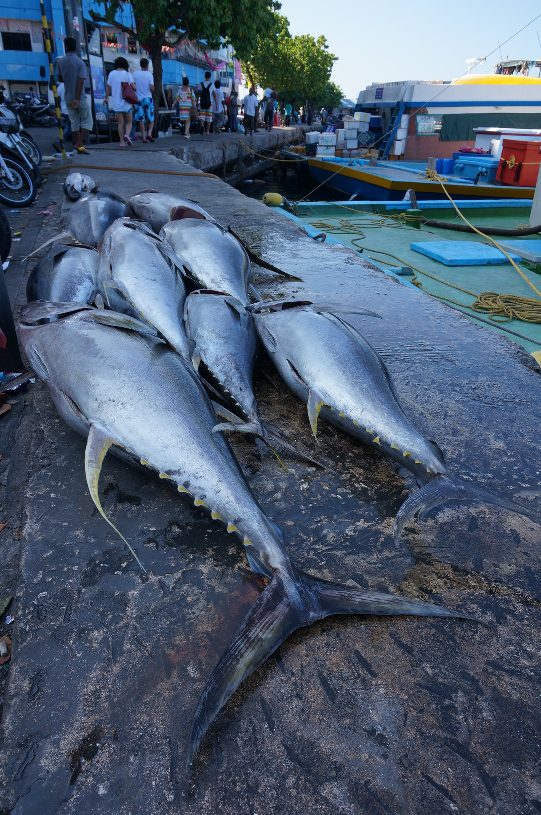 モルディブの首都マレにて。 海沿いを歩いていると道端に巨大な魚たちが! これはいわゆるマグロではないの!? 一匹くらい持って帰っても誰も気づかぬのでは。