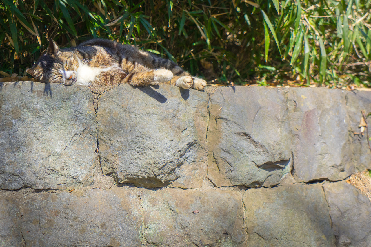 ポカポカ陽気に寝心地の良い(?)石垣、もう動くことはできないでしょう!?