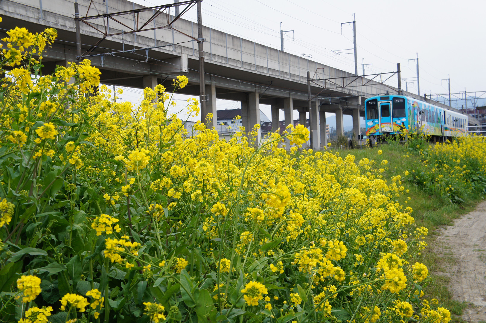 肥薩おれんじ鉄道の車両を背景にして、菜の花を撮影しました。