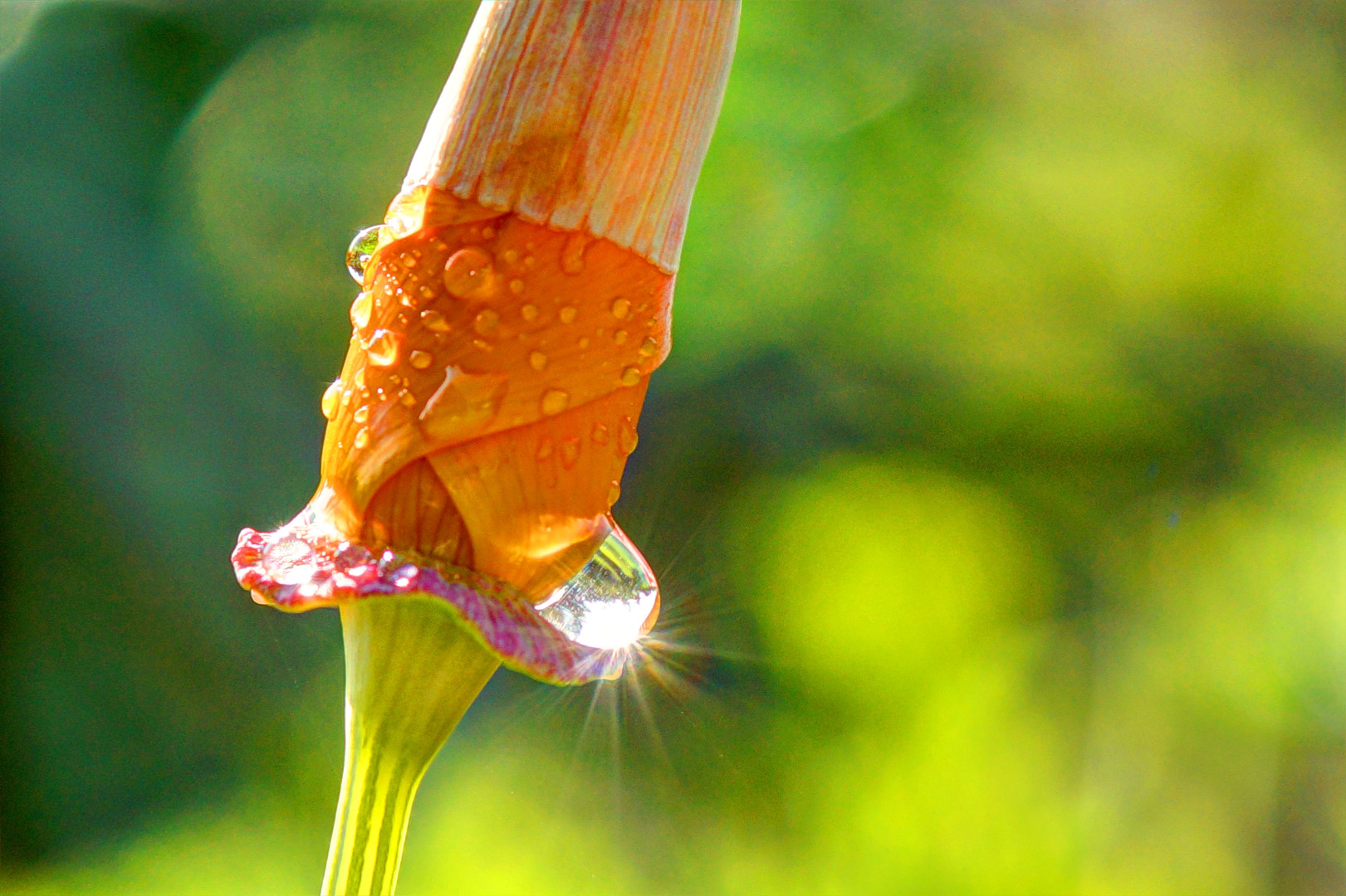 開花直前のカルフォルニアポピーに降りた朝露がほんの数分間輝き、きれいな光芒を見せてくれた。